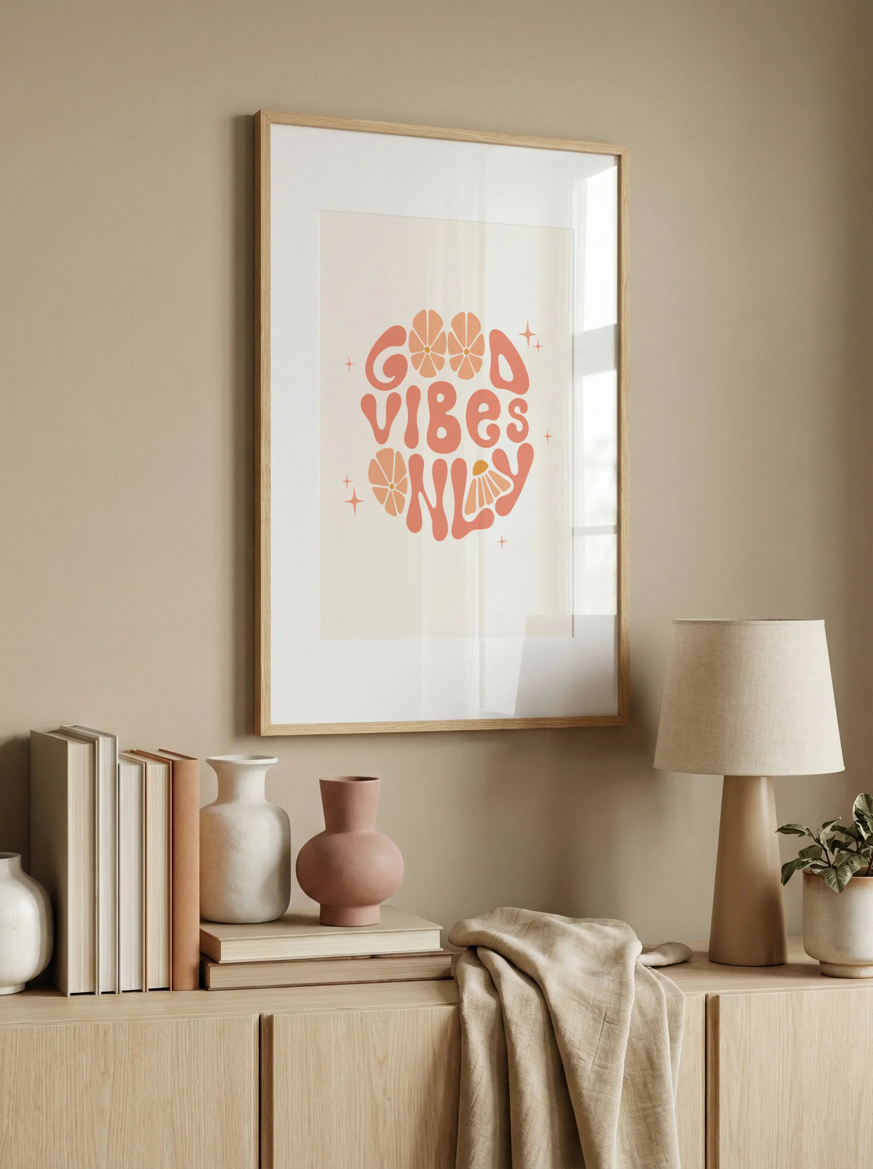 Plakat Good Vibes Only to wysokiej jakości dekoracja ścienna, która doskonale wpisuje się w nowoczesne trendy aranżacji wnętrz. Doda przestrzeni świeżości i charakteru.